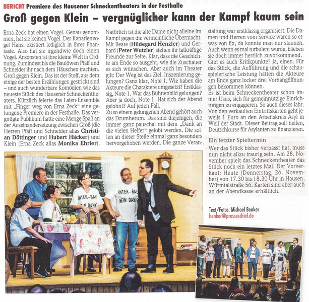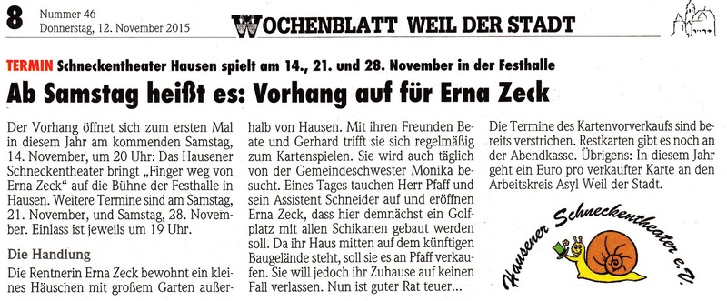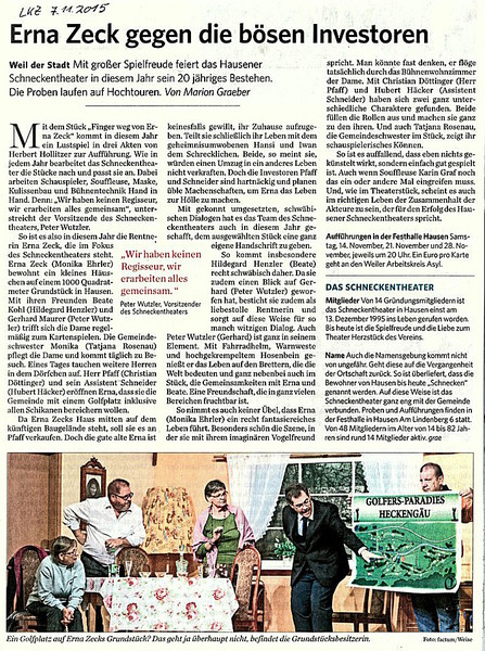 Eines Tages tauchen Herr Pfaff und sein Assistent Schneider auf und eröffnen Erna Zeck, dass hier demnächst ein Golfplatz mit allen Schikanen gebaut werden soll.